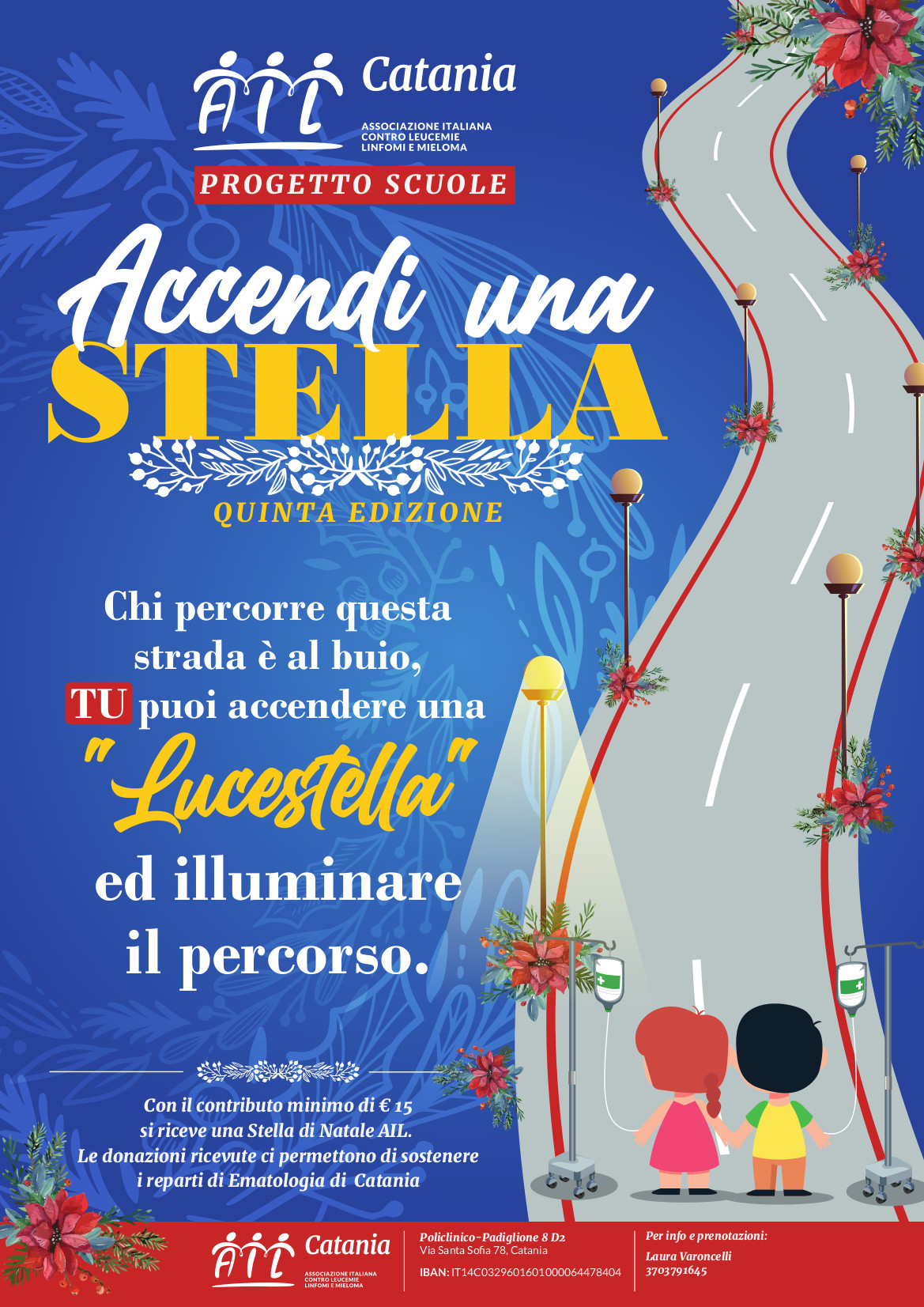 A Catania la manifestazione tradizionale su piazza è prevista dalle ore 9 alle ore 19, per le 4 giornate, presso: Anche per questo Natale, oltre alla tradizionale Stella, è possibile scegliere un altro ormai tradizionale simbolo di solidarietà: i Sogni di Cioccolato AIL, al latte o fondente, con nocciole IGP del Piemonte, con un contributo minimo di 15 euro per ciascun tipo. Abbiamo previsto un servizio unico di prenotazione, tramite telefono al n. 370.3791645 o email: info@ailcatania.it, oppure direttamente online, al nostro sito AIL Catania eDonazioni. Nel catalogo dei nostri prodotti solidali natalizi, visibile e/o scaricabile cliccando qui, oltre le Stelle tradizionali (classiche piantine) o di cioccolato, sono presenti i panettoni Fiasconaro (tradizionali o al cioccolato) e altri prodotti solidali. Dal 19 Novembre i nostri volontari vi aspettano presso la postazione AIL del Policlinico di Catania in Via Santa Sofia n.78, Padiglione 8, piano 0 (di fronte al bar) dal lunedì al venerdì, dalle ore 9.30 alle ore 12.30. È possibile richiedere il servizio di consegna a domicilio, al costo aggiuntivo di € 3 per consegna, a fronte di un minimo di 3 prodotti solidali scelti e solo su alcune zone. La richiesta è soggetta a verifica di disponibilità, per cui è necessario contattare il numero 370.3791645 prima di effettuare un ordine. ACCENDI UNA STELLA V edizione Per sensibilizzare i giovani studenti catanesi, che adottando almeno una pianta per classe potranno sia dare luce alla speranza dei pazienti ematologici che collaborare per tenere in vita la Stella di Natale in Istituto, è nato nel 2021 questo progetto. A fronte di un contributo minimo di € 15 si riceverà una stella. Illuminiamo insieme il buio percorso di cura per gli affetti da malattie del sangue! I fondi raccolti dalla sezione AIL di Catania saranno impiegati per: (Post del: 12 Ott 2025)